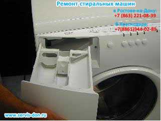 - Дозатор для бытовой химии (порошка). Для вытаскивания этой детали нужно отыскать пластиковую кнопку в центре этого лотка, нажать её, а затем подтянуть к себе – таким образом этот элемент будет вытащен.