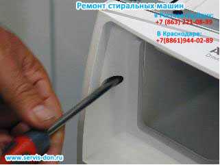 Следующий этап разборки – снятие контейнера для стиральных порошков. Для этого достаточно отжать его фиксатор. После этого начинается более сложный и ответственный этап разборки – снятие уплотнительной манжеты. С помощью отвертки достаем стопорное кольцо и аккуратно снимаем его с манжеты. Здесь главное – делать все не спеша. Манжету порвать очень легко, а это уже лишние расходы. Теперь заправляем ее внутрь машины, чтобы она не мешала.