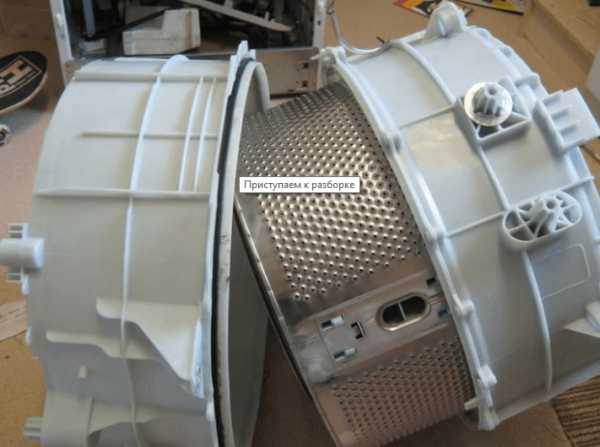 Демонтаж неразборных баков практически неотличим от снятия разборных аналогов. В отличие от стиральной машинки с разборным барабаном, здесь добавляется еще один специфический процесс — распиливание. Перед распилом на неразборной бак наносят отверстия под крепеж — чем вы больше сделаете их, тем лучше будут стянуты половинки.