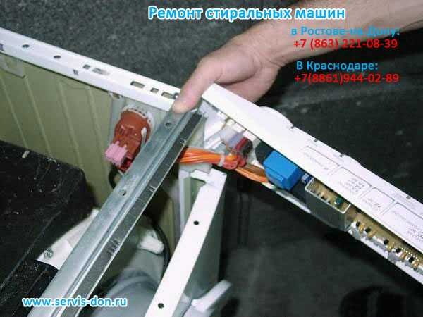 - Снятие панели управления. Для крепления этого элемента стиральной машины используют всего несколько винтов. Один обычно находится сразу под ёмкостями для моющих средств, а другой – в противоположном месте. Она очень хрупкая деталь поэтому действовать следует осторожно. Чтобы её не повредить, положите её либо сверху на машинку, либо повесьте на особый крючок.