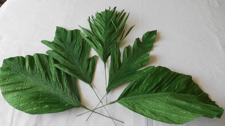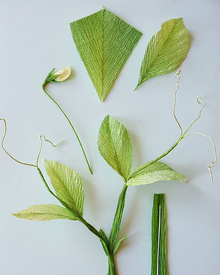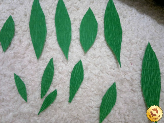- Теперь осталось подумать как сделать листочки. Из гофрированной бумаги зелёного цвета они получаются практически настоящими и для этого из неё нужно просто вырезать листья соответствующей формы. Затем следует немного разгладить готовые детали пальцами, чтобы придать им больше гладкости.