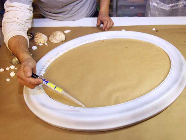 - Нанести слой клея по контуру зеркала, приклеить мелкие ракушки.