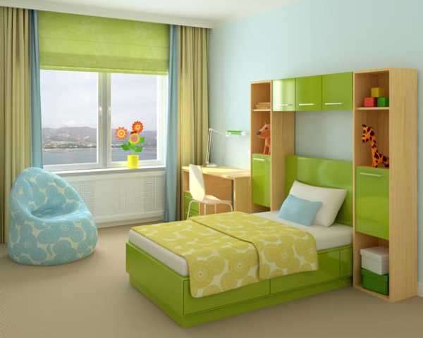 Для комнаты детей школьного возраста удачным решением послужит откидная кровать, благодаря которой сохранится максимум свободного пространства.