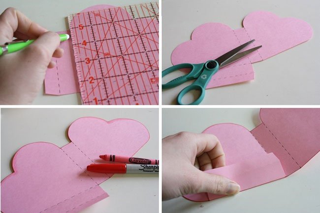 Рисуем форму коробочки, то есть 2 сердца, перегородочку между боковыми сторонами и отвороты для скрепления. Вырезаем форму, вкладываем по линиям. Проклеиваем нужную часть и даем высохнуть. На лицевой стороне можно написать пару слов и положить в коробочку сюрприз.