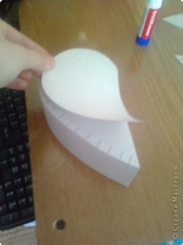 и приклееваем к краю от уголка закругленной части сердца, в конце оставшийся хвостик отрезаем, приклееваем вторую полоску с другой стороны сердца, так отрезаем хвостик.