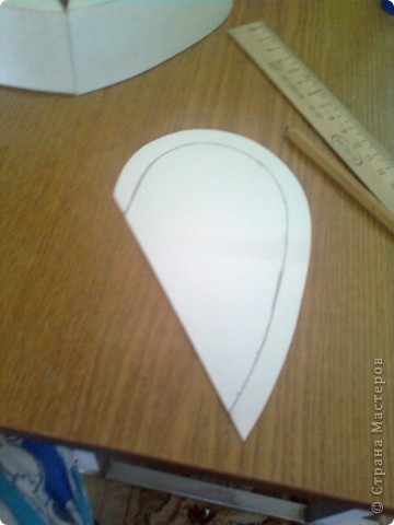 Далее берем шаблоныик по которому мы рисовали половинки. Со стороны где уголок рисуем сердце на от края на 1 см., а в закругленной части на 2 см.