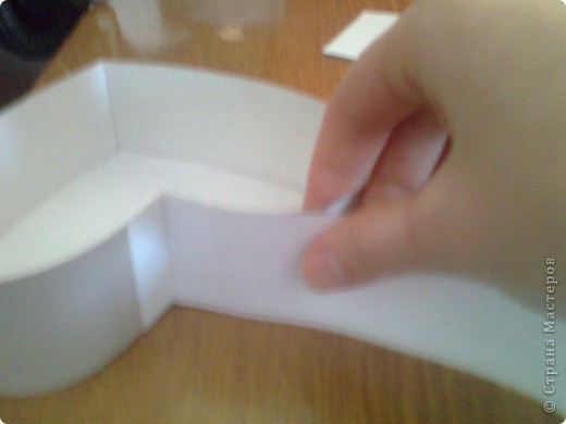 Приклеиваем боковую часть к основанию коробки и отрезаем излишки, оставляя небольшой хвостик, чтобы в дальнейшем склеить со второй частью стенки.