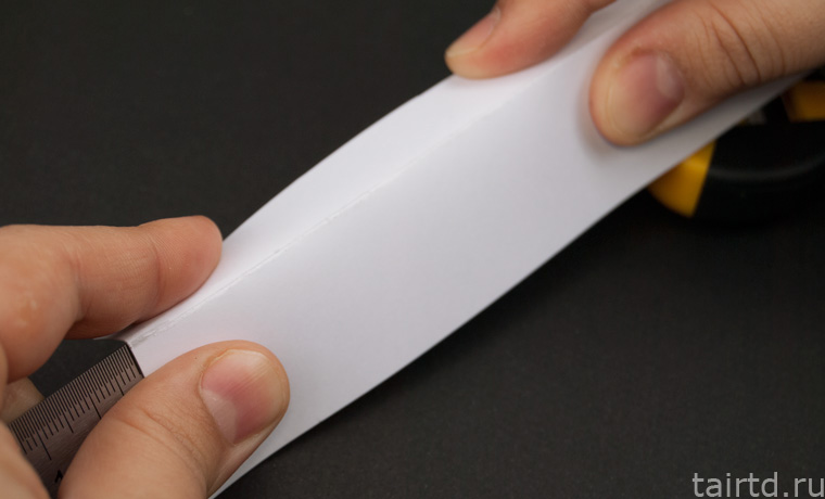 Делаем биговку на месте сгиба: по линейке аккуратно продавливаем бороздку неострым предметом. Мы воспользовались обратной стороной канцелярского ножа, но прекрасно подойдёт и непишущая ручка, и тупая сторона ножниц.