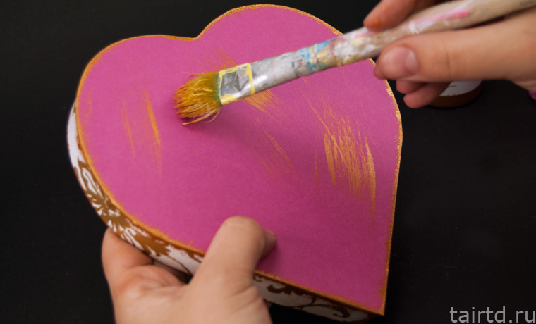 Делаем несколько нарочито-небрежных мазков сухой кистью на крышк, чтобы поддержать золотой цвет на стенках коробки.