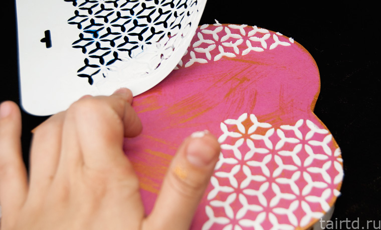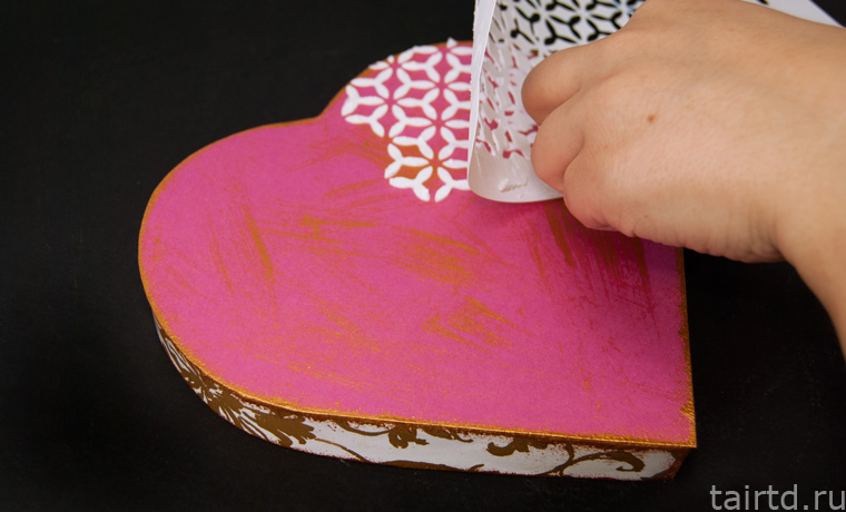 Займемся декором крышки. Прикладываем трафарет в правый верхний угол сердца и наносим через него рельефную пасту.