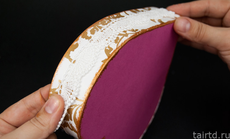 Приклеиваем кружево посередине боковины коробки. Мы специально делали расчеты для крышки чуть больше, чтобы эта кружевная лента не помешала коробке закрываться.