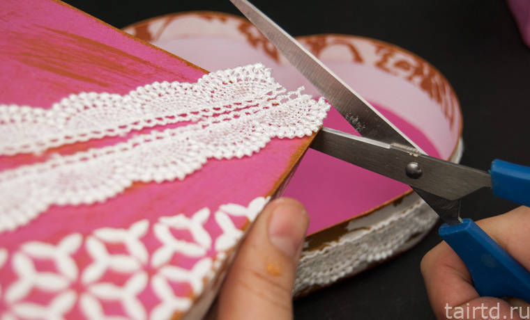 Приклеиваем на свободное от рельефной пасты пространство несколько кружевных лент.