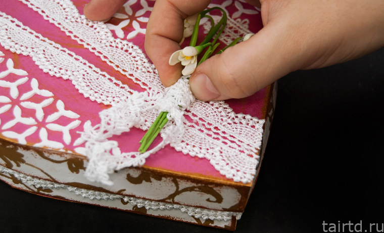 Завершающий штрих: обвязываем кружевом небольшой букетик из чудесных искусственных подснежников. При желании вы можете использовать и настоящие цветы. Это будет гораздо романтичнее, но чтобы цветы не завяли, нужно будет прикрепить их совсем незадолго до времени дарения подарка :)