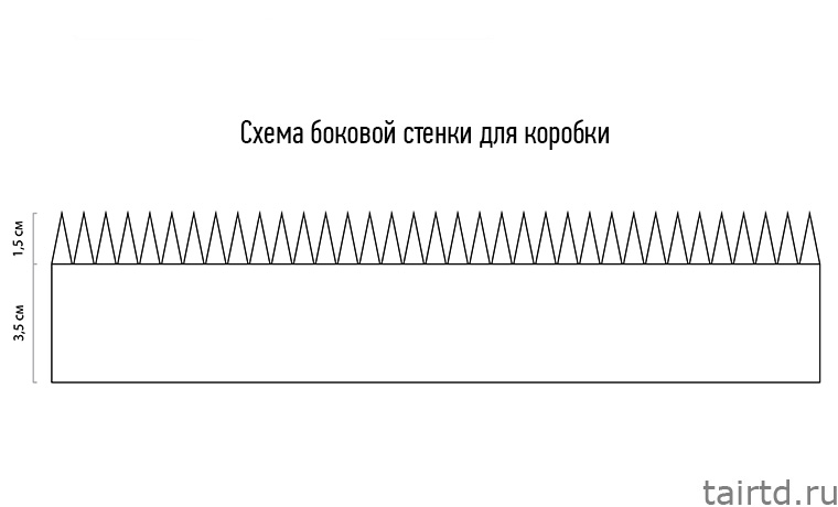 Отдельно расчерчиваем боковины. Глубина нашей коробки — 3,5 см. Ещё полтора сантиметра оставляем для «зубчиков», которые будем приклеивать к основанию коробки. Длину делаем с запасом, излишки проще отрезать после приклеивания.