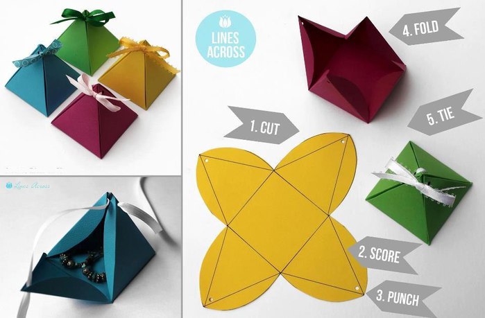 Бумажные подарочные коробки делаются быстро и легко, и их можно адаптировать различными способами в зависимости от случая или подарка внутри. Размер коробки можно регулировать в зависимости от размера используемой бумаги. Готовая коробка всегда будет иметь четверть размера исходного бумажного квадрата, если измерять от угла до угла. Эти коробки отлично подходят для небольших подарков и сувениров для вечеринок, их можно персонализировать для праздников или в соответствии со стилем получателя, украсив бумагу резиновыми штампами и другими украшениями.