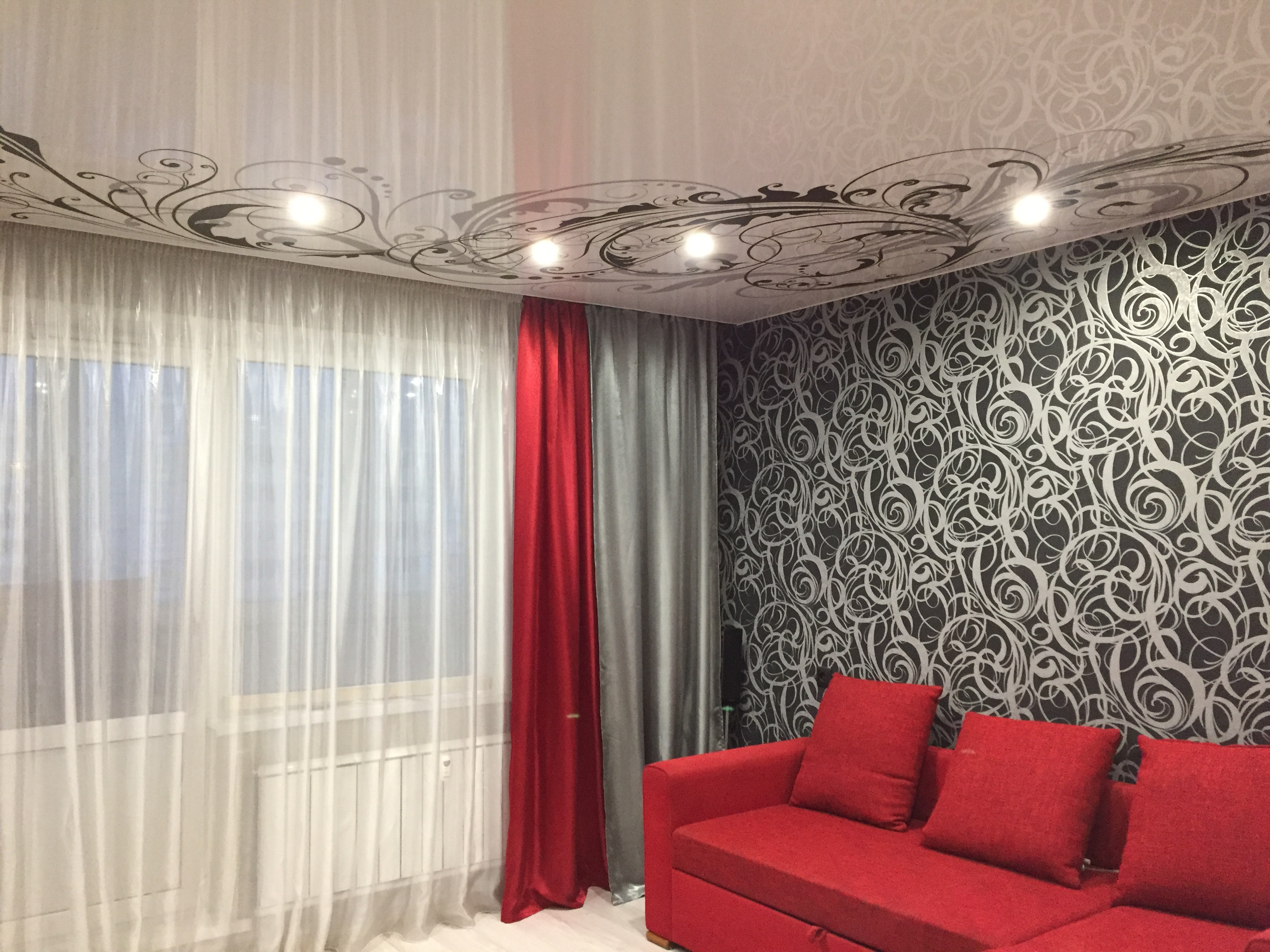 По образцам натяжных потолков для зала можно выбрать подходящую фактуру: матовую, глянцевую, сатиновую либо полотно в виде напечатанной фотографии или картины.