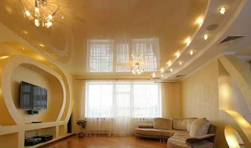 Этот вид отделки потолка позволяет дать волю фантазии дизайнера, ведь можно совмещать натяжное полотно и лист гипсокартона. Также данный вариант дает возможность сделать потолок в зале, как матовым, так и глянцевым, придав ему требуемого окраса.