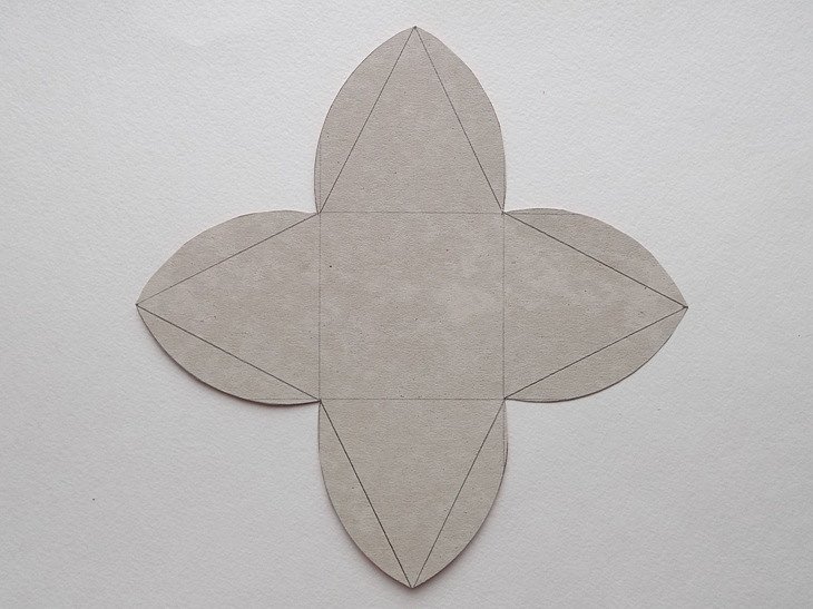 Распечатайте шаблон на обычной белой бумаге. Вырежьте и согните по линиям. На узкой детали нужно сделать горизонтальный надрез линии, которая указана стрелочкой.