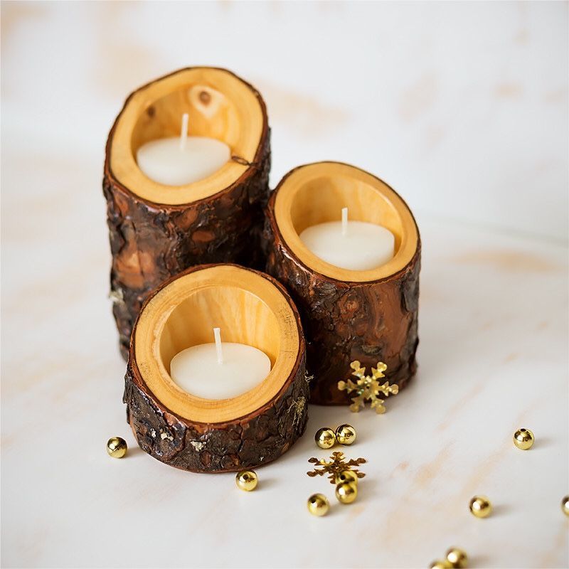 Пожалуй, один из простейших способов добавить обычным греющим свечам немного уюта и духа загородного дома — это найти в лесу довольно толстые упавшие ветви, распилить их на части высотой примерно 10 см, внутри которых вы сможете сделать углубление для свечи.