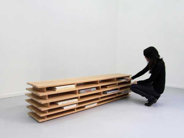 Стеллаж, выполняющий роль полки, скамьи и низкого столика