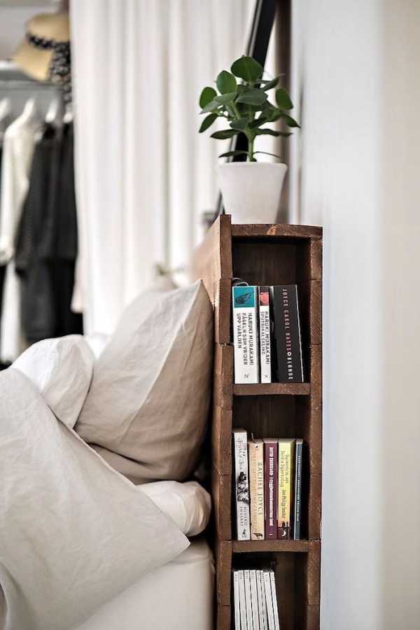 Книжные полочки в изголовье — идеальный вариант для маленьких помещений