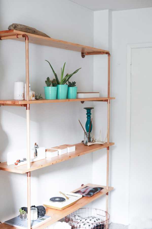 Даже водопроводные трубы можно использовать в качестве каркаса для стеллажа