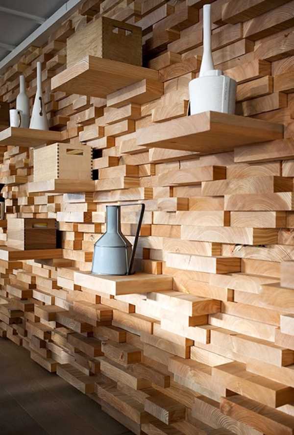 Интересный стеллаж из древесины на всю стену