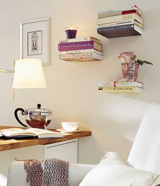 Несколько кронштейнов, саморезы — этого достаточно, чтобы создать эффект парящих в воздухе книг. Проще не придумаешь!