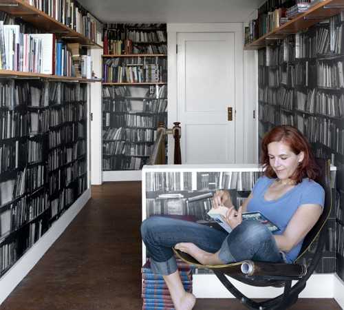 Создаём эффект огромной библиотеки. Просто нанесите на стены фото-обои с реалистичным изображением книжных полок. Сверху разместить настоящие полки с книгами. Ощущение пребывания в большой уютной библиотеке обеспечено!