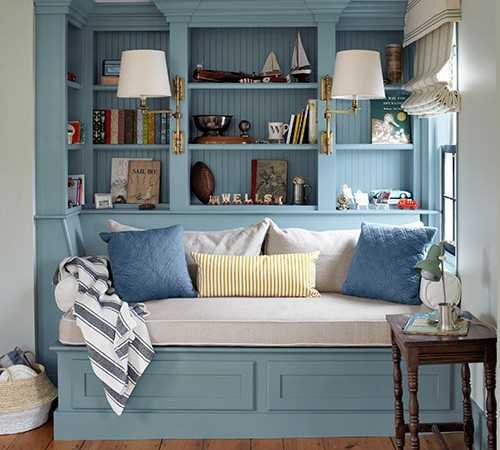 Совместить диван и книжные полки — это отличная мысль! Выбрал книгу и не надо далеко идти, чтобы предаться увлекательному чтению. Особенно хорош данный вариант для детской.