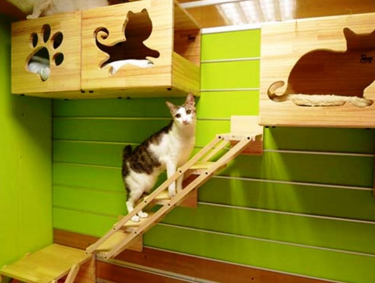 Полезными дополнениями для кошачьего дома являются когтеточки и лазалки. Когтеточки — это вертикальные поверхности, которые обычно обматываются веревкой из натуральных волокон. Лазалки — горизонтальные и наклонные дощечки, по которым кошки могут переходить с одного уровня на другой. Когтеточки, кстати, тоже могут использоваться как лазалки — по ним зверье забирается на верхние ярусы.