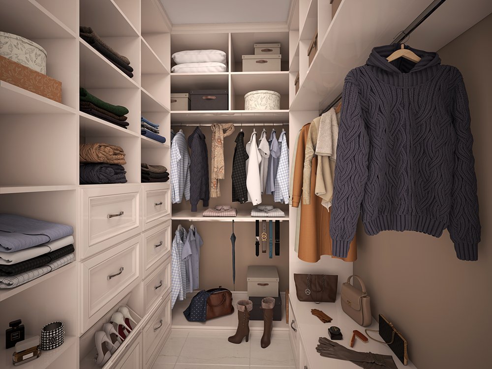 Они расположены в отдельной комнате и открыты не для всех. Это отдельная гардеробная. Они отгорожены друг от друга дверьми или шторами. Все пространство комнаты не перепутано, так как платья присутствуют в каютах, а не повешены повсюду. Возвращать их на место не нужно, так как оно закрыто за дверями. Это дает возможность предоставить место для платьев всем членам семьи, независимо от того, насколько велика или мала гардеробная.Есть много свободных мест, куда можно добавить и другую мебель.
