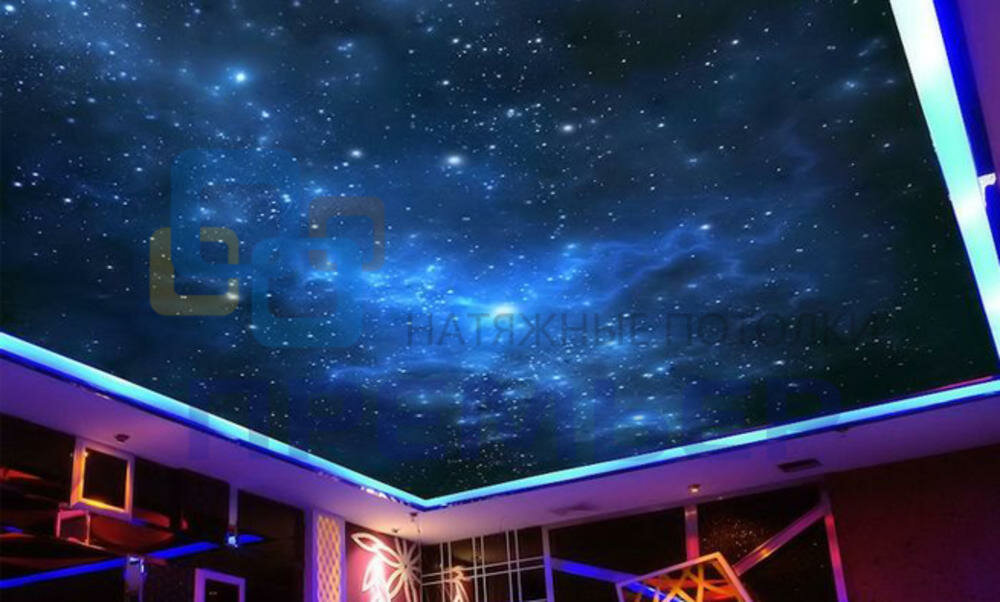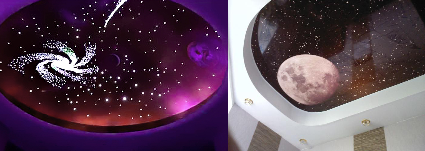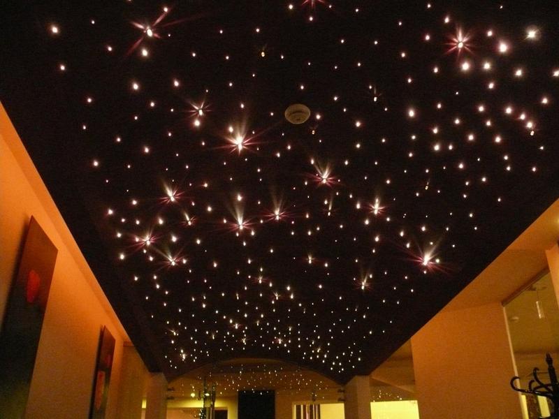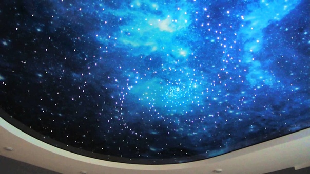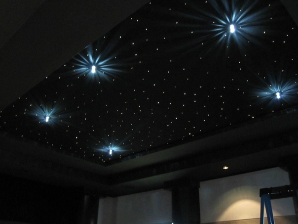 Очень реалистично смотрятся оптоволоконные нити, протянутые через натяжной потолок. Для этого понадобится установить светогенератор в удобном месте: нити будут питаться от него. Кончики нитей выводятся через дырочки в натяжном потолке, каждый кончик образует звездочку. Нити можно выводить на большую длину — получится эффект комет — а можно и вовсе не проводить через полотно, лишь упереть в него кончики: свет получится более мягким и загадочным.