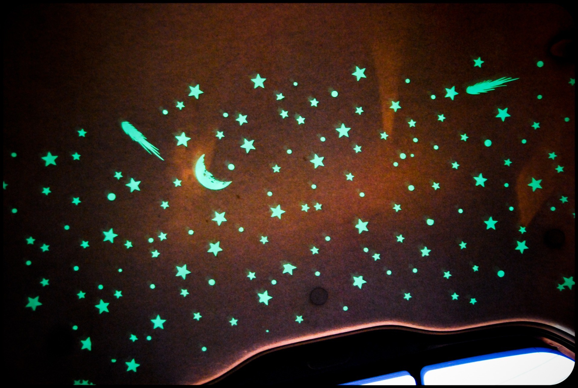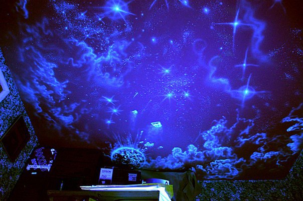 - Рисовать невидимыми флуоресцентными красками. Днем потолок будет таким же белым, как обычно, а при включении УФ-лампы рисунок проявит себя во всей красе.