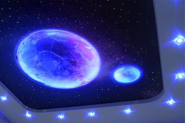 Потолочные панели «Звездное небо» — это большой плоский светильник, который монтируется на потолок почти как люстра. На панели нанесен рисунок ночного неба или космоса, а внутри расположена лампочка, которая подсвечивает рисунок и оживляет его. Боковые стороны панели тоже светятся приглушенным светом, часто цветным, что помогает визуально растворить границы светильника.