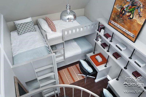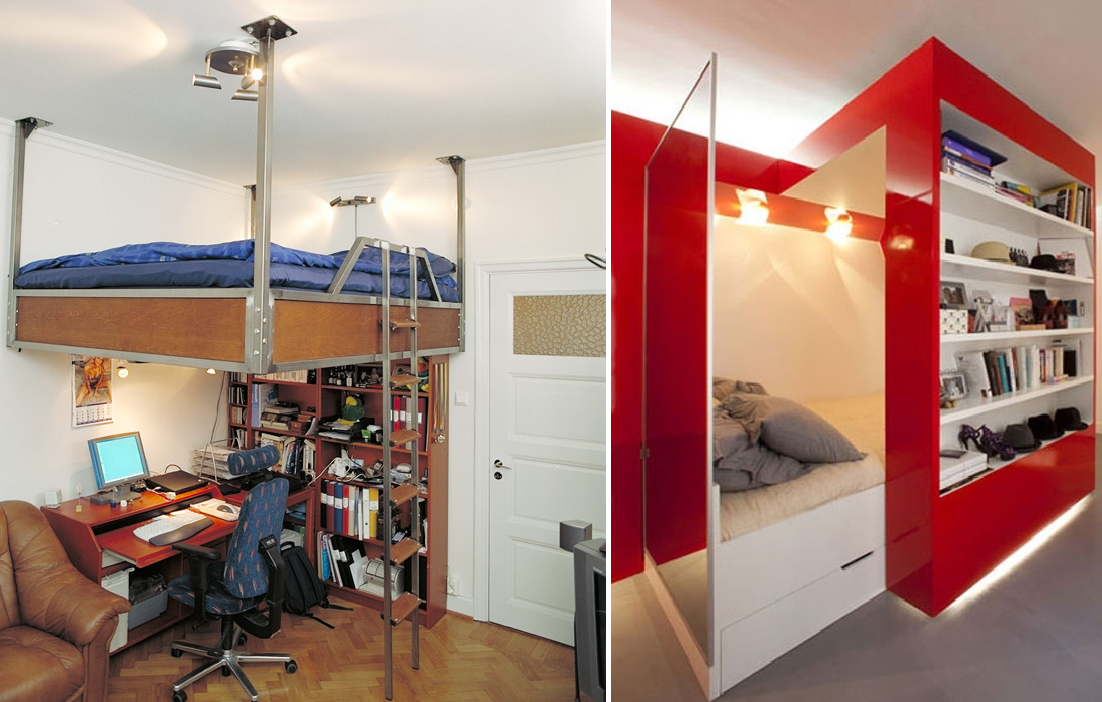 Если в спальне есть ниша, в неё можно встроить кровать или же шкаф. Этот способ отлично подойдёт для тех, кто ещё не сделал ремонт и только планирует его. Можно сделать нишу больше и устроить в ней целый гардероб, тогда необходимости в громоздких шкафах в спальне больше не будет. Тумбочки возле кровати можно сделать подвесными. Также можно сделать подвесные шкафы для хранения одежды и личных вещей. Двухъярусная кровать подойдёт для детской. Так в спальне будет больше места для размещения игровой и рабочей зоны для ребёнка. Если же ребёнок один, можно приобрести двухъярусный стол-кровать (это стол, над которым встроена кровать).