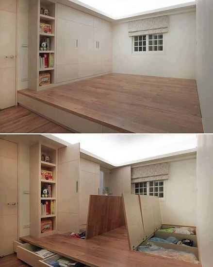 Идея поднять пол и соорудить подиум очень хороша, например, для детских комнат. В подиуме может быть размещено несколько отделений для хранения игрушек, книг и других детских вещей. Также пол в детской можно поднять на всей площади комнаты, а доступ к отсекам для хранения игрушек организован через снимающиеся крышки — фрагменты напольного покрытия. Очень удобно и быстро убираться!