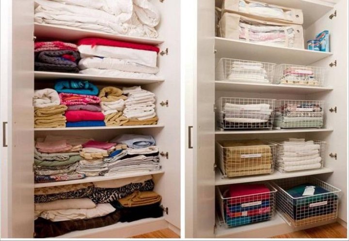 - Для начала выберите отдельные полки для каждого типа белья (простыни, наволочки и пододеяльники).