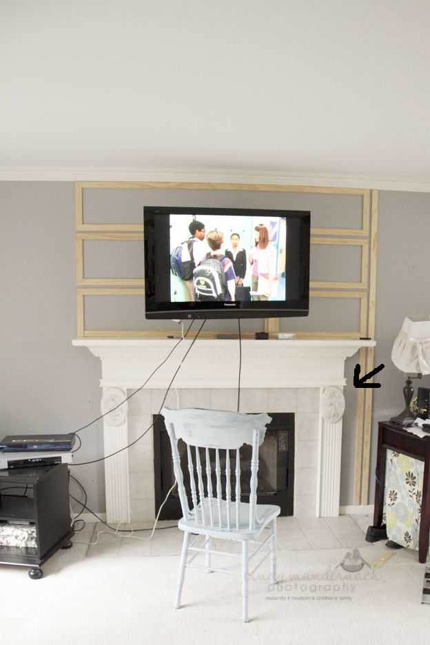 Bless’er House построил целую искусственную каминную полку с распашной дверцей в нижней части коробки, чтобы обеспечить доступ к электрической розетке, а также для потенциального хранилища электроники или носителей. (опубликовано здесь на «Ремоделоголике») И книги, сложенные под телевизором, покрывают короткий шнур, прежде чем он попадет в каминную полку!