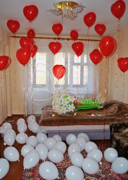 Просто разложите на кровати шары без гелия в форме сердечек, а в центр поместите мягкую игрушку или другой подарок. Можно надуть изделия газом и создать мини-облачко над кроватью, а по бокам разместить композиции с грузами. Прием с подарком, описанный ранее, также подойдет.