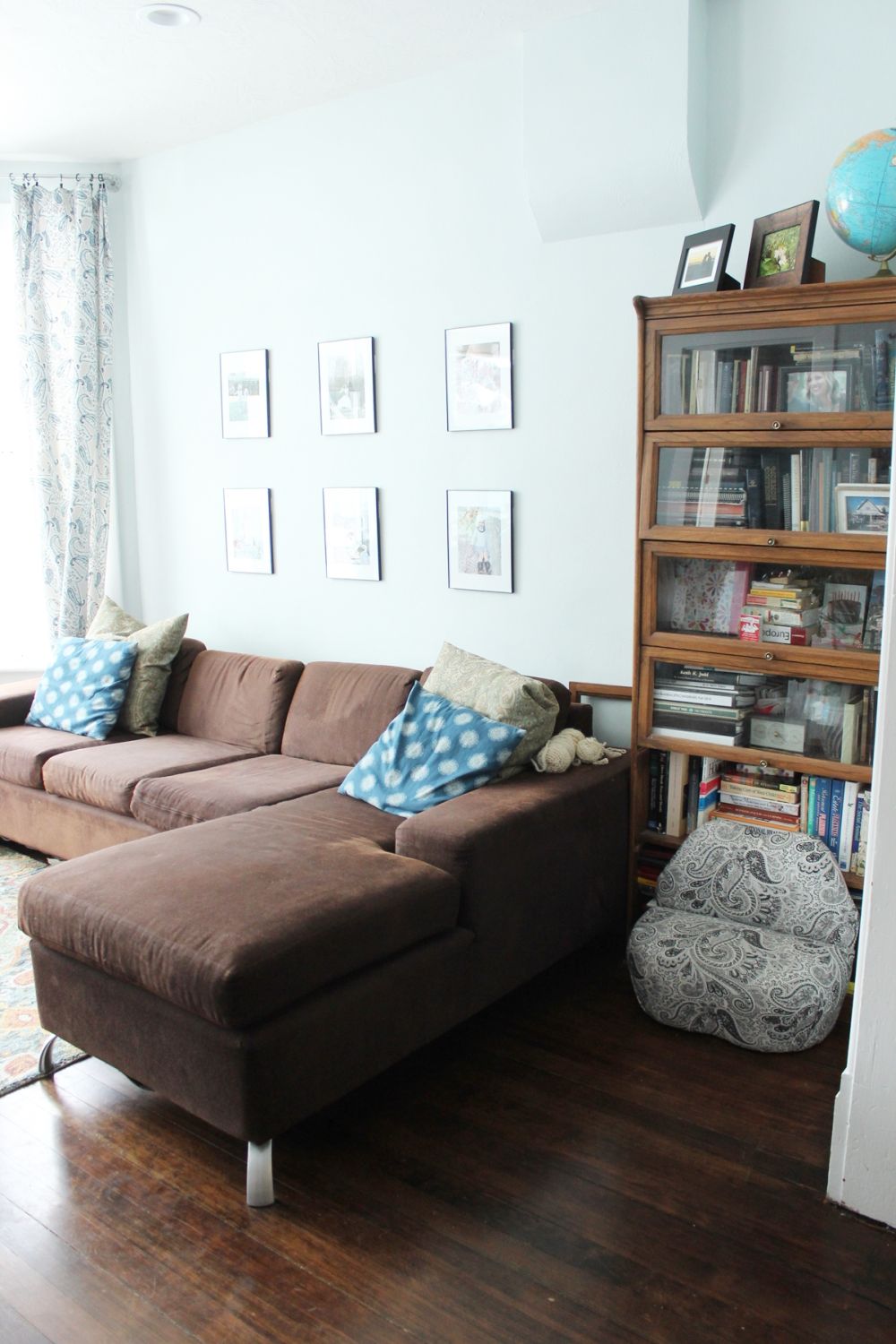 Если встроенные полки не имеют смысла для вашего пространства, например, если вы арендуете или просто не можете заставить встроенные модули работать, вы можете легко перейти к Плану B : большой, прочный книжный шкаф на одной стороне большой стены и некоторые произведения искусства в пустом пространстве.Обратите внимание, как диван расположен здесь со смещенным центром, хороший баланс визуального веса с деревянными книжными полками, расположенными сбоку.