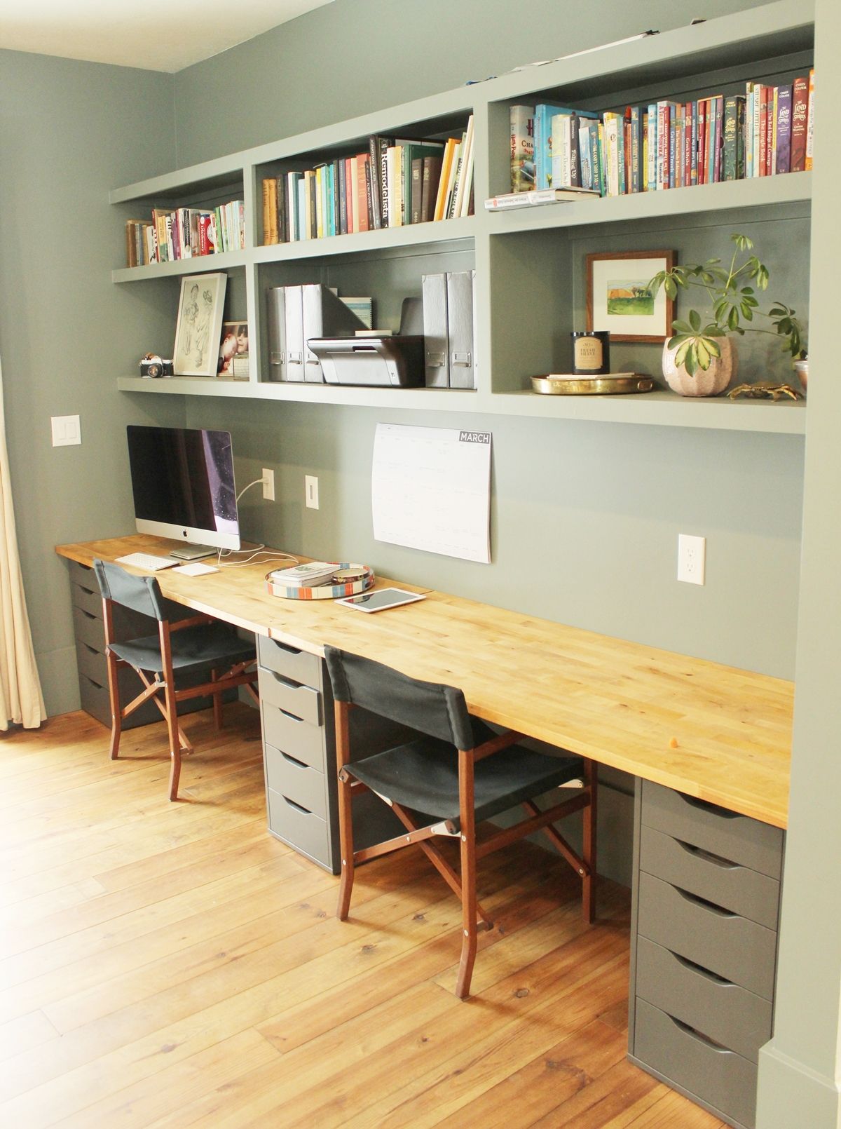 Если ваша большая стена падает между двумя перпендикулярными боковыми стенками, вы можете обнаружить, что лучший способ «украсить» большую стену — это извлечь из нее пользу. Встроенные полки не только добавляют функциональность вашему пространству, но и обеспечивают мгновенную возможность для декора, а также повышают ценность вашего дома. Стол на нижней половине большой стены еще больше повышает удобство использования.