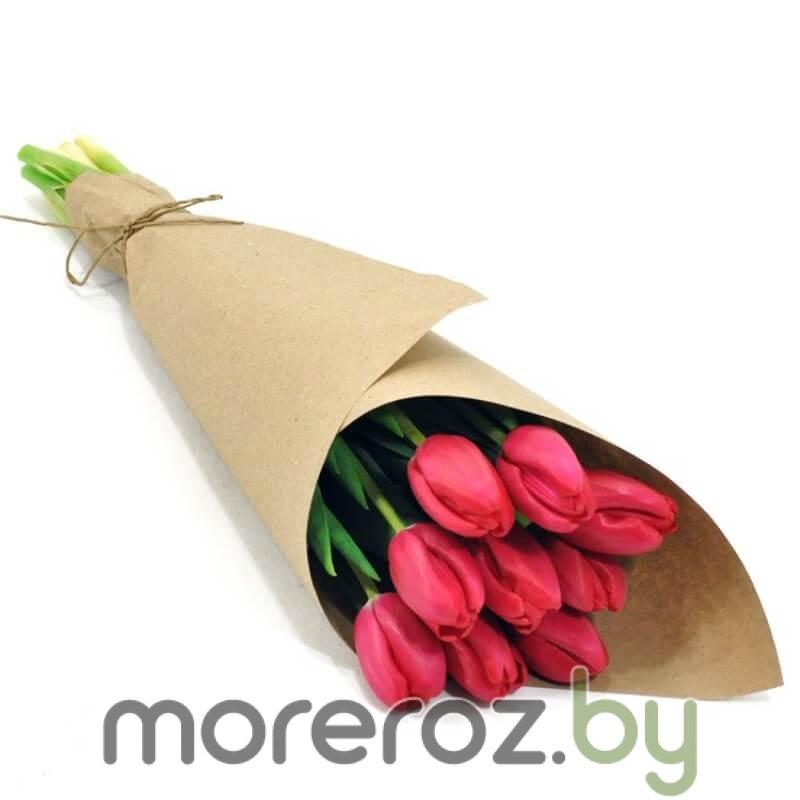Отдельно нужно сказать про оттенки тюльпанов. Крафт-бумага может как дополнить букет, так и сделать вид дешевым. Например, с ней хорошо сочетаются алые тона, малиновые, сиреневые, а вот нежные бело-розовые выглядят слегка тускло. Как выход сочетание разной фактуры бумаги и тканей.