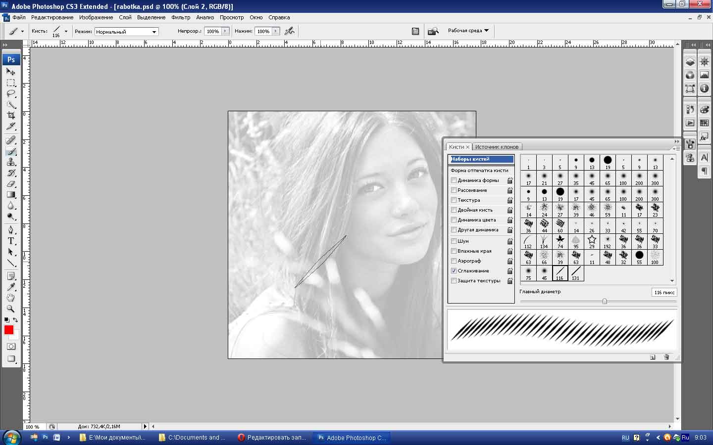 Установим цвет переднего плана (Foreground) на белый (#ffffff) и настроим размер карандаша на 1 рх с жесткостью (Hardness) 100%.