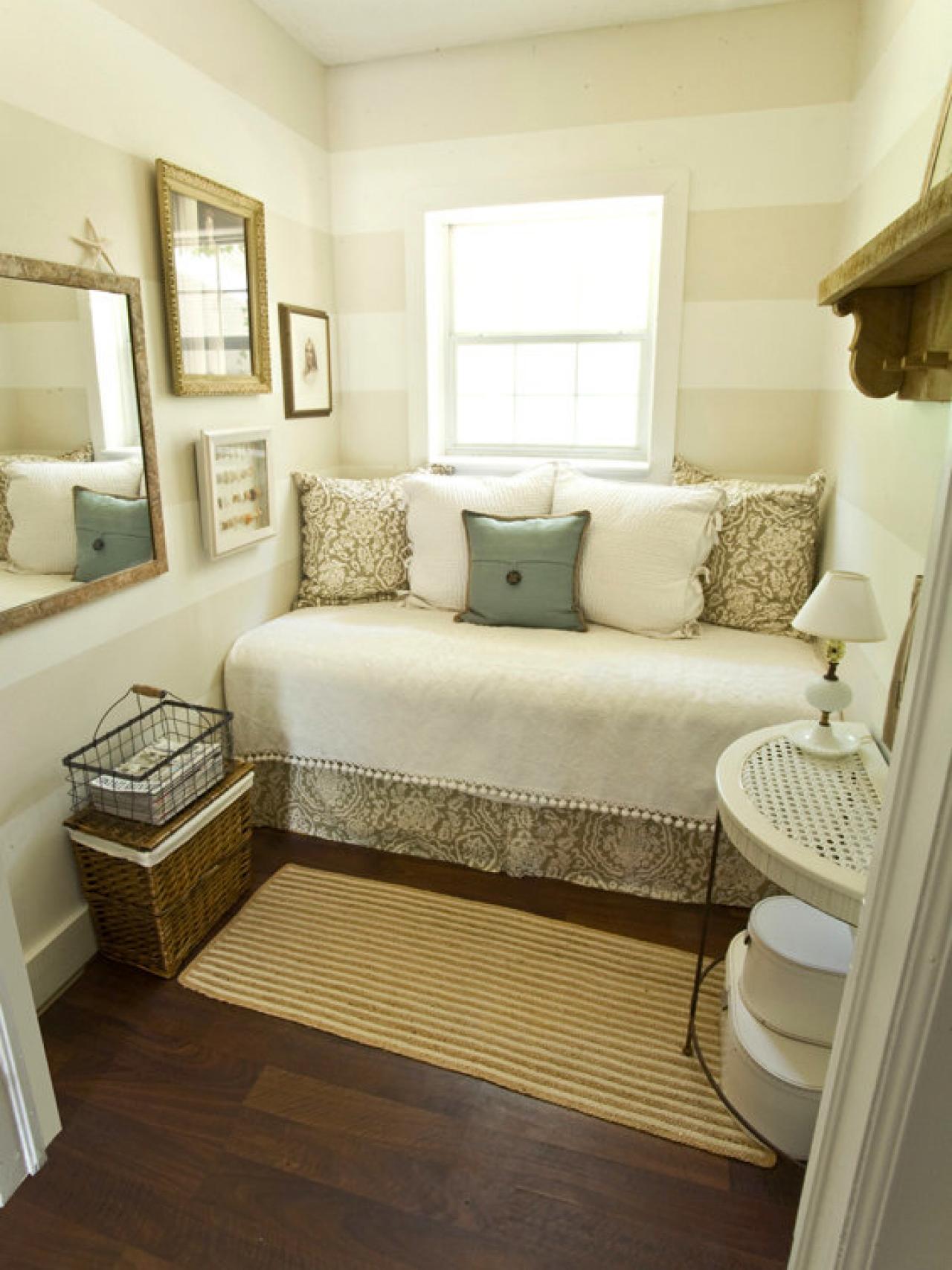 - В маленькой комнате много мелких предметов декора (безделушки, подсвечники, статуэтки и т.д.) будут смотреться визуально захламлять пространство. Поэтому постарайтесь все лишнее убрать.