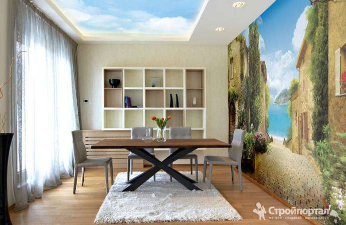 При использовании правильного рисунка в комнате с низкими потолками возникает иллюзия бесконечности. Например, при нанесении фрески или фотообоев в виде неба или облаков на потолок, помещение сразу же станет выше и просторнее.