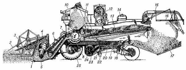 Комбайн по сбору зерновых культур представляет собой сложный механизм, который выполняет полный технологический цикл, включающий такие операции: