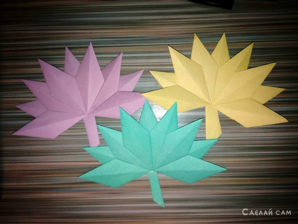 В готовом виде получаем изделие «объемный кленовый лист» из цветной бумаги: