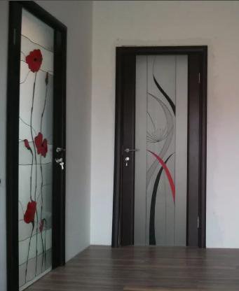 - Стекло повышенной прочности (триплекс, матолюкс, каленое) применяют для создания цельных полотен в конструкциях с распашными и раздвижными створками. Стеклянные межкомнатные двери лучше ставить там, где нужно усилить естественное освещение. Они бывают прозрачными, матовыми, с рельефными или оттеночными узорами. Практикуется использование стекла в качестве декоративных вставок различных форм и размеров.