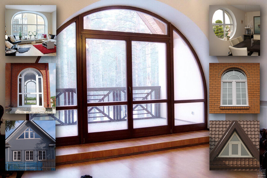 Фото: Серое окно и стальная ручка и петли. Темно-коричневое окно и золотая ручка и петли. Белое окно и стальная ручка и петли.В частном домостроении есть возможность применять окна нестандартных форм: арочные, круглые, трапециевидные. Стоит помнить, что технология производства таких окон более сложная, при нарушении процесса впоследствии с таким окном могут быть проблемы.